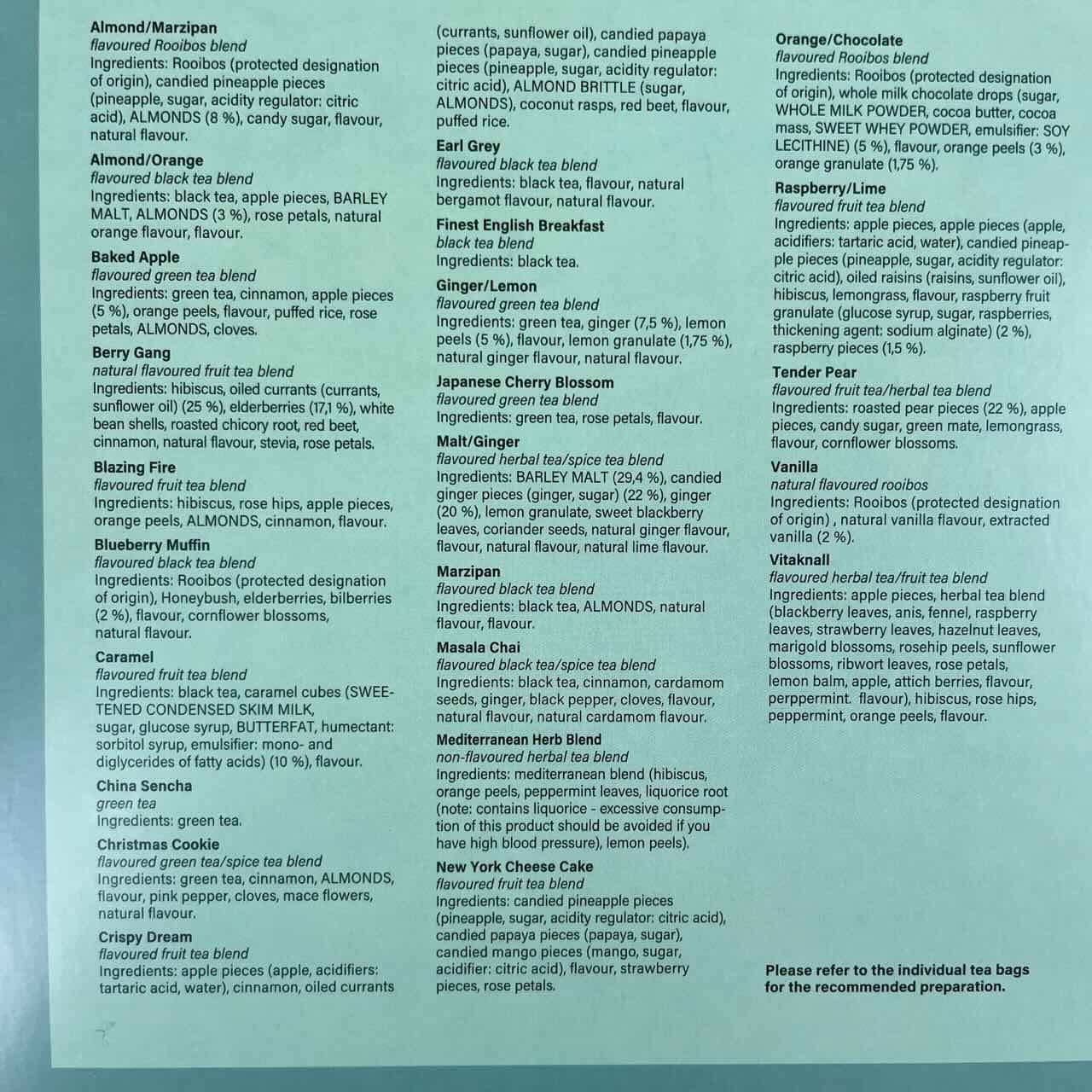 Il calendario si apre ed è perfetto per essere appeso. Una volta aperto misura 31 cm di larghezza e 98 cm in altezza. Sul retro del calendario sono indicati gli ingredienti di tutte le miscele.