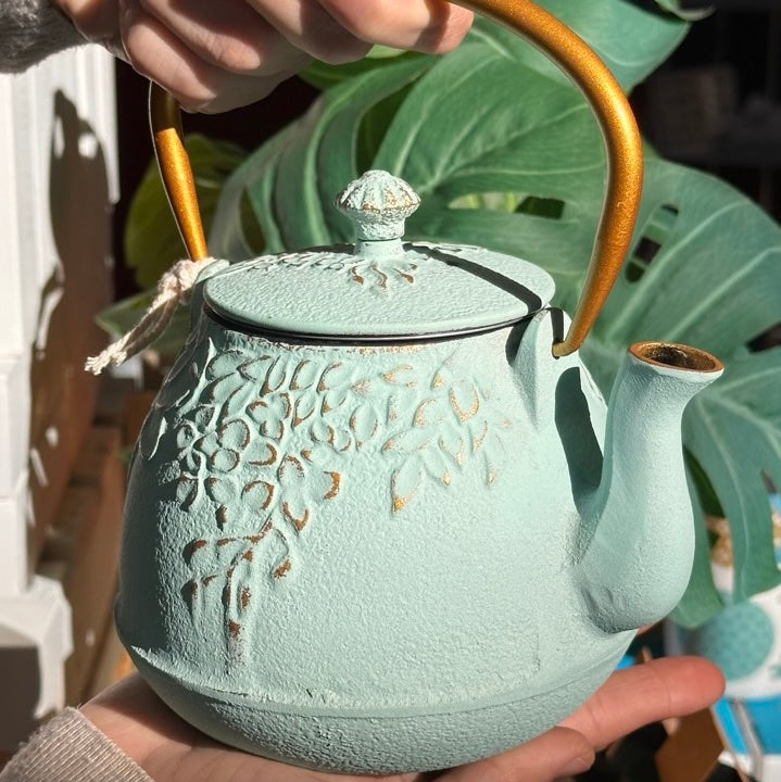 Teekanne aus Gusseisen in der Farbe Hellblau-Aquagrün mit eleganten goldenen Oberflächen . Es ermöglicht die Zubereitung von 3-4 Tassen Tee und ist mit einem ausgestattet Edelstahlfilter . Der Innenraum ist emailliert, was die Reinigung erleichtert und Rostbildung verhindert. Darüber hinaus ermöglicht die innere Emaille das Aufgießen verschiedener Teesorten, ohne dass die Teekanne deren Geschmack annimmt.